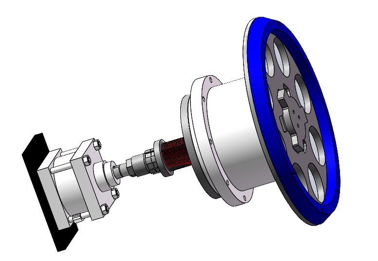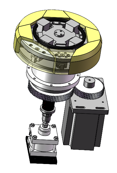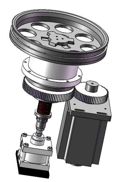 | 1. The operator activates the cylinder extension via the touch screen. 2. The spring compresses and the pressing plate extends. The operator places the upper turntable, rotates it to align with the slots, then engages it. 3. The operator retracts the cylinder via the touch screen, allowing the spring to reset, securing the upper turntable onto the main spindle of the bearing seat. |